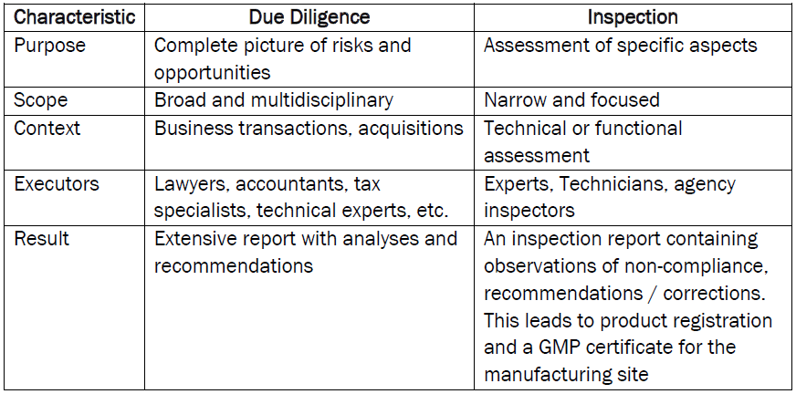 The differences between due diligence and an audit/inspection lies mainly in the scope, purpose and context in which they are carried out.