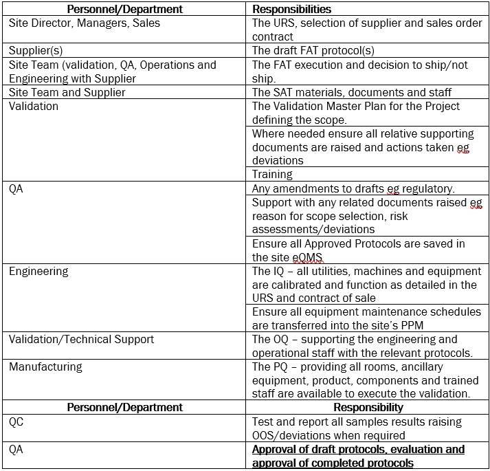 So, the default way of thinking risks being: “it is the Validation staff”. This can lead to misunderstanding and mistakes. Clear roles and responsibilities for a Validation exercise must be defined to ensure that all activities are covered and managed. The Validation staff obviously have overall responsibility for planning & coordinating the process.